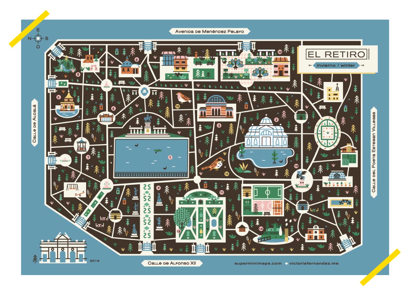We wanted to create a map for the wonderful green space that is 'El Retiro' Park in Madrid, an unmistakable icon, an essential green lung, an art space, a holder of legends, an inspiration, a muse, a climate refuge.
